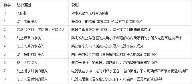在這個標(biāo)準(zhǔn)中,針對電氣設(shè)備外殼對異物的防護(hù),IP等級的格式為IPXX,其中XX為兩個阿拉伯?dāng)?shù)字,第一標(biāo)記數(shù)字表示接觸保護(hù)和外來物保護(hù)等級,第二標(biāo)記數(shù)字表示防水保護(hù)等級,具體的防護(hù)等級可以參考下面的表格。